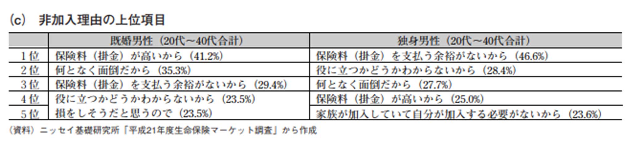 上の表を見てもらえればわかるように、独身男性が保険に加入しない理由の多くは独身ならではのライフスタイルに訴求できていないからではないかということも読み取ることができます。